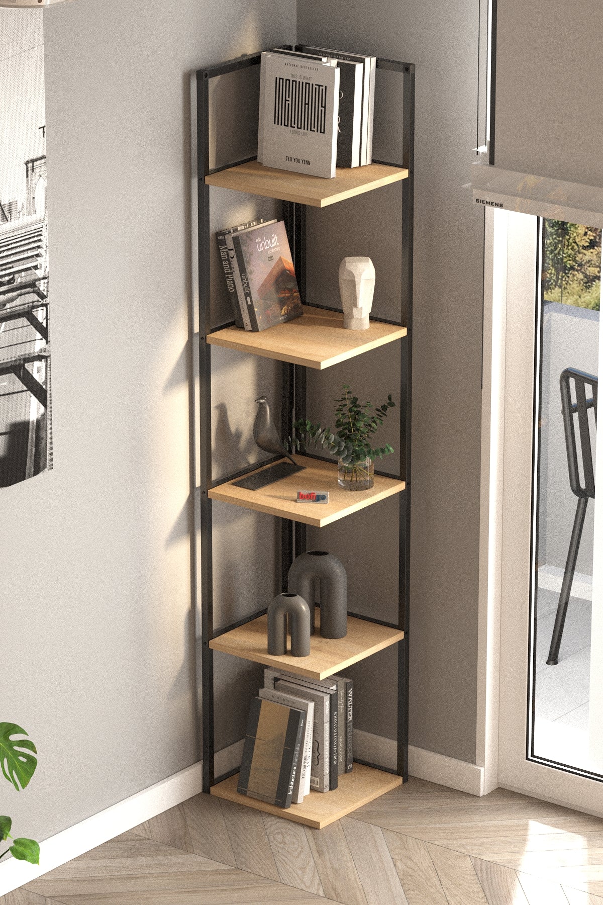 Plasează raftul de colț în spații care de obicei rămân goale - lângă ferestre, în colțurile livingului sau dormitorului. Combină funcționalitatea cu estetica prin expunerea de cărți, plante sau obiecte decorative pe rafturi.